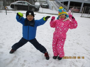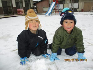 少ない雪でしたが、雪玉をたくさん作って『雪合戦』をしたり、雪だるまづくりをして、友だちと一緒に楽しみました。